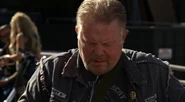 Nate, Russell, and other masked men then use the purchased AK-47's to ambush a prison convoy and free one of their members. A shoot-out ensues and a police officer and two innocent bystanders are killed. While fleeing, Meineke drops his cell phone at the scene. Back at the clubhouse, the Sons are discussing their problems with continuing their gun business with the IRA. Chibs says that McKeavey was very clear in that the Irish need $200,000 up front within the week, or they will be forced to find new buyers. In the middle of this meeting, ATF Agent June Stahl and other law enforcement arrive outside and arrest Clay. Agent Stahl informs them of the shootout that took place earlier that morning and says that while no charges have been placed against Clay yet, they need to ask about his relationship to Nate Meineke, whose cell phone listed Teller-Morrow Automotive as the last call.