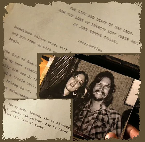 Jax begins looking through boxes of old belongings in his parents' garage, finding old photographs of his late father John Teller, who founded the club after returning from service in Vietnam. He also finds a journal entitled The Life and Death of Sam Crow: How the Sons of Anarchy Lost Their Way, written by him for his sons Jax and Tommy (who died in 1990). When he is called away to a club meeting, Jax hides the journal. At the clubhouse, all charter members have gathered in the "Chapel", the club's meeting room. Intelligence officer Juice has located the guns stolen from the warehouse, now being stored by the Mayans in San Leandro. Clay wants to find the guns, steal them back, and torch the place where they were found. However, Bobby, the club Secretary, cannot attend as he is performing an Elvis impersonation in Lake Tahoe that night.