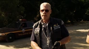 Members of the Sons of Anarchy MC then arrive at the warehouse, after driving past a road sign reading "Thank you for visiting Charming". Charming, a small town in Northern California, is watched over by the outlaw motorcycle club calling themselves the Sons of Anarchy Motorcycle Club, Redwood Original Charter (aka SAMCRO or "Sam Crow"), who are also involved in gun running. Finding that the police are already there, Clay, the club President, speaks to Sheriff Vic Trammel about the blaze. He claims that propane tanks inside the building exploded, but suspects arson due to the bootprints around the area. He then shows SAMCRO the charred corpses in the basement, and Clay tells him to dispose of them. They were Mexican illegal immigrants being housed in the building by Tig, SAMCRO's Sergent-At-Arms, in exchange for sexual favours. After Jax gives him money in order to alert the fire department about the incident, Trammel asks what he's "supposed to tell the boys up in East Bay", referring to the One-Niners, a street gang who buy weapons from SAMCRO. Clay responds by telling him to set up a meeting.