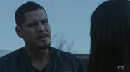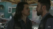 EZ returns to the Mayans MC clubhouse and is assigned to fix a bike while everyone else meets to discuss an upcoming business meeting. They also know that Galindo was released and they got to Emily while in custody and it rattled her. Felipe and EZ talk more and confirm that Angel doesn’t know a thing. He hangs up and Felipe and Jimenez say goodbye.